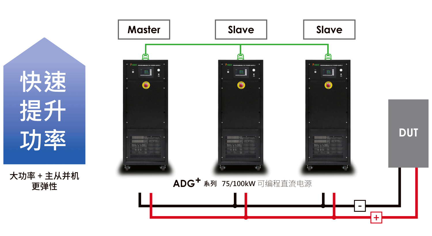 ADG+系列單機功率最高可達100kW,可透過簡易之主從并機設置(Max. 5 臺) 加大輸出功率至500kW,用戶僅需在主機上操作和設置,從機即可接收數據并達到均流之效果,為市場上少數在單機大功率直流電源具有并機功能,可單機或并機使用,應用上更彈性。