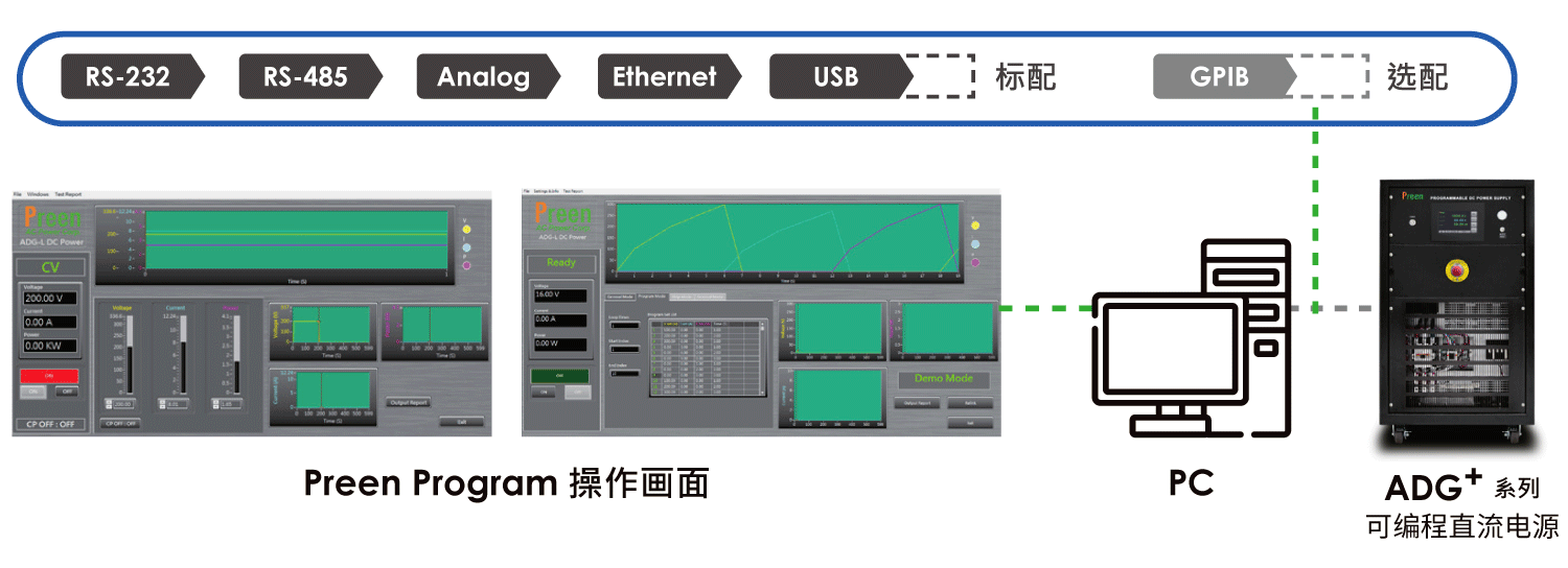 ADG+ 系列提供專屬的遠程操作軟件Preen Program,用戶能透過標配或選配的通訊介面連接到計算機,做遠端遙控操作、程序設置、測試報告導出等功能,操作清晰、簡易,增加其機能性及方便性。標配 RS-232、RS-485、Analog、Ethernet、USB通訊接口,方便遠程監控及編程; 亦可選配GPIB,以滿足工業 4.0自動化測試應用的需求。